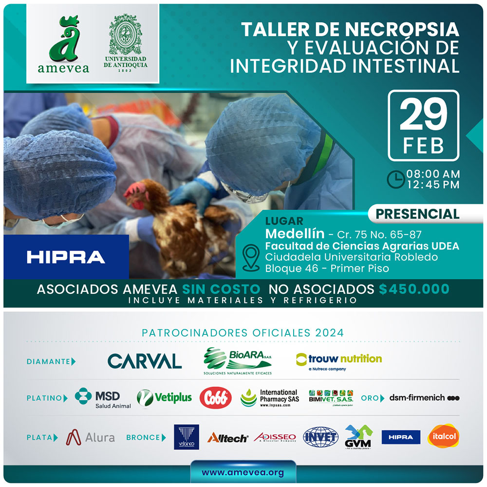 Taller de Necropsia y Evaluación de Integridad Intestinal es un evento académico organizado por la Asociación Colombiana de Médicos Veterinarios y Zootecnistas Especialistas en Avicultura (AMEVEA) que permite actualizar a técnicos y profesionales dedicados a la avicultura, en las últimas investigaciones y tendencias que se han desarrollado en torno al sector Avícola.